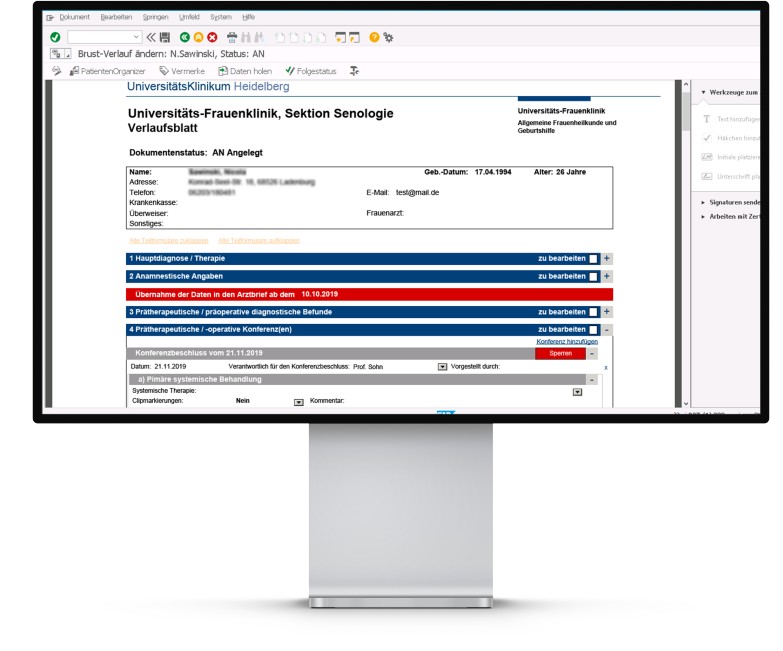 A solution for medical documentation in healthcare environment. Based on HTML5 and XFA technology it allows structured document oriented data aquisition and presentation as well as integration in electronic health records. SAP R/3 based integration in i.s.h.med hospital information system and HTML5 based electronic health records, modules for data synchronisation based on XML and JSON and integration of standard interfaces as CDA are available. Further integration modules as HL7 FHIR will follow.